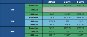 From 1 September 2025, the fees will be the below rates. For ease, the chart below sets out the amount you will be invoiced depending on the age of the child and the funding you are eligible to claim for.